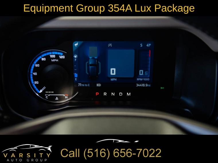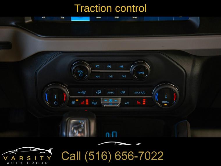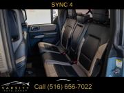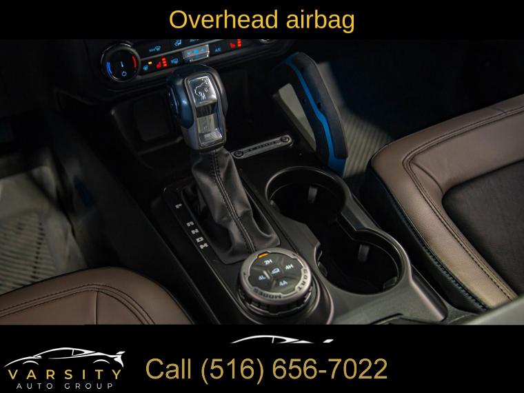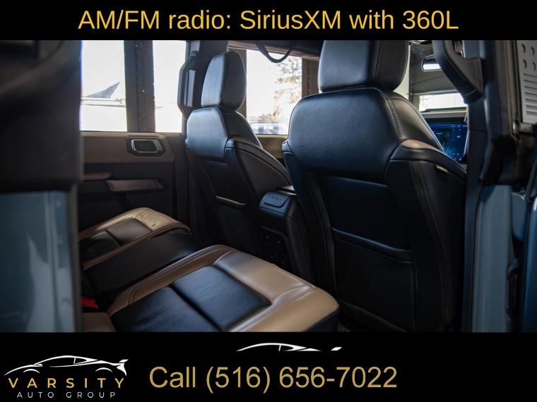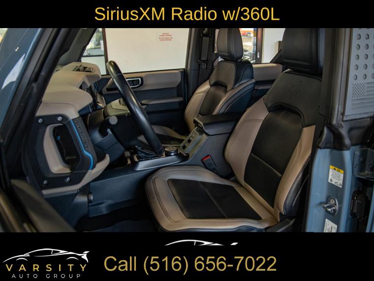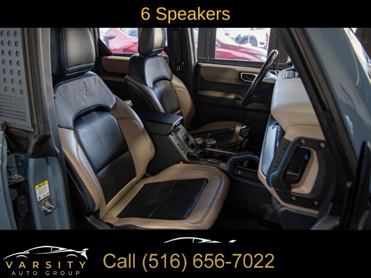 Equipment Group 354A Lux Package, 6 Speakers, AM/FM radio: SiriusXM with 360L, AM/FM Stereo, Radio data system, Radio: B&O Sound System by Bang & Olufsen, SiriusXM Radio w/360L, SYNC 4, Air Conditioning, Power steering, Power windows, Remote keyless entry, Steering wheel mounted audio controls, Universal Garage Door Opener, Traction control, 4-Wheel Disc Brakes, ABS brakes, Dual front impact airbags, Dual front side impact airbags, Emergency communication system: 911 Assist, Front anti-roll bar, Front wheel independent suspension, Integrated roll-over protection, Low tire pressure warning, Occupant sensing airbag, Overhead airbag, Brush Guard, Ford Performance Heavy-Duty Modular Front Bumper, Brake assist, Electronic Stability Control, Exterior Parking Camera Rear, Front Parking Sensors, Rear-View Camera, Auto High-beam Headlights, Delay-off headlights, Fully automatic headlights, Keyless Entry Keypad, Panic alarm, Security system, Adaptive Cruise Control, Speed control, Front Steel Bash Plates, Heated door mirrors, Power door mirrors, Sideview Mirrors, 12" LCD Capacitive Touchscreen w/Swipe Capability, 2 Smart Charging USB Ports In Dashboard, 360-Degree Camera, Additional Sound Deadening, Compass, Connected Built-In Navigation, Driver door bin, Driver vanity mirror, Evasive Steering Assist, Front & Rear Floor Liners, Front reading lights, Heated Steering Wheel, Illuminated entry, Information on Demand Panel, Outside temperature display, Overhead console, Passenger vanity mirror, Tachometer, Telescoping steering wheel, Tilt steering wheel, Trip computer, Wireless Charging Pad, Front Bucket Seats, Front Center Armrest, Split folding rear seat, Passenger door bin, Alloy wheels, Wheels: 17" Black Gloss-Painted Steel, Variably intermittent wipers, 2022 Ford Bronco Wildtrak 4-Door, Area 51, Medium Sandstone w/Black Onyx w/Heated Leather-Trimmed/Vinyl Bucket Seats, 17" Black Aluminum Beadlock Black Ring Wheels, 35" tires, Clean CARFAX