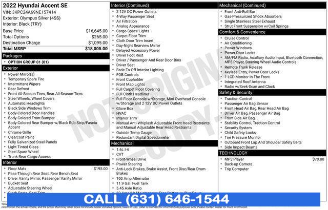 2022 Hyundai Accent Olympus Silver Metallic * NYS INSPECTION INCLUDED *, * FULL INTERIOR / EXTERIOR DETAIL *, * BLUETOOTH *, * LIMITED NYS LEMON LAW WARRANTY INCLUDED *, *FRESH OIL CHANGE *, * 150 MULTI POINT INSPECTION *, Black Cloth. Odometer is 22675 miles below market average! 33/41 City/Highway MPG