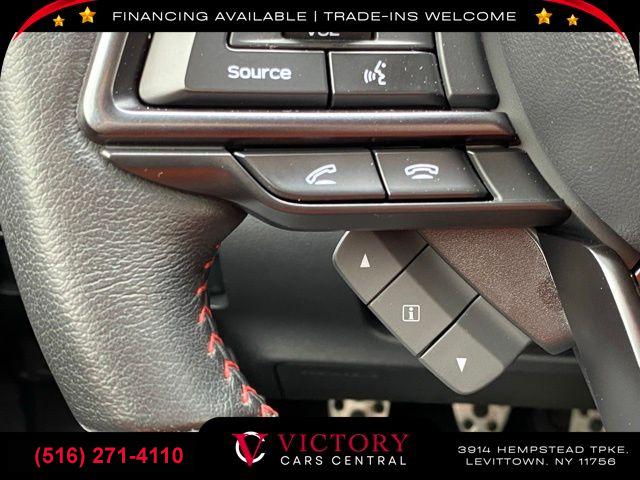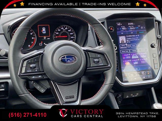 Standard Model (6MT), 6 Speakers, AM/FM radio: SiriusXM, Radio data system, Radio: Subaru STARLINK 11.6" Multimedia Plus Sys, Air Conditioning, Automatic temperature control, Front dual zone A/C, Rear window defroster, Power steering, Power windows, Remote keyless entry, Steering wheel mounted audio controls, Four wheel independent suspension, Speed-sensing steering, Traction control, 4-Wheel Disc Brakes, ABS brakes, Dual front impact airbags, Dual front side impact airbags, Emergency communication system: STARLINK Safety and Security (Subscription Required), Front anti-roll bar, Knee airbag, Low tire pressure warning, Occupant sensing airbag, Overhead airbag, Rear anti-roll bar, Brake assist, Electronic Stability Control, Exterior Parking Camera Rear, Auto High-beam Headlights, Front fog lights, Fully automatic headlights, Panic alarm, Security system, Speed control, Bumpers: body-color, Heated door mirrors, Power door mirrors, Spoiler, Auto-dimming Rear-View mirror, Driver door bin, Driver vanity mirror, Front reading lights, Illuminated entry, Leather Shift Knob, Leather steering wheel, Outside temperature display, Overhead console, Passenger vanity mirror, Performance Design Heated Front Bucket Seats, Rear seat center armrest, Sport steering wheel, STARLINK/Apple CarPlay/Android Auto, Tachometer, Telescoping steering wheel, Tilt steering wheel, Trip computer, Cloth Upholstery w/Red Stitching, Front Bucket Seats, Front Center Armrest, Heated front seats, Split folding rear seat, Passenger door bin, Alloy wheels, Wheels: 18" x 8.5" Dark Gray Finish Alum Alloy, Variably intermittent wipers
