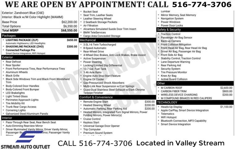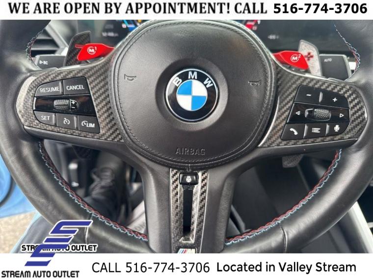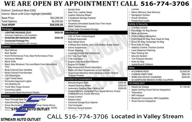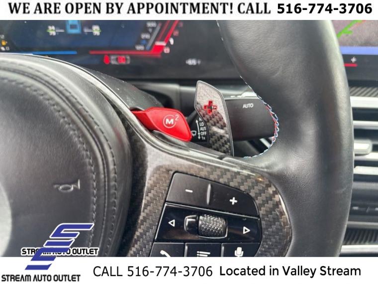 Navigation, Navigation System, Connected Package Pro, Lighting Package, Shadowline Package, AM/FM radio: SiriusXM, AM/FM Stereo, harman/kardon Surround Sound System, harman/kardonĀ® Speakers, Radio data system, SiriusXM Satellite Radio, Air Conditioning, Automatic temperature control, Front dual zone A/C, Rear window defroster, Head restraints memory, Lumbar Support, Memory seat, Power driver seat, Power steering, Power windows, Remote Engine Start, Remote keyless entry, Steering wheel mounted audio controls, Adaptive suspension, Four wheel independent suspension, Speed-sensing steering, Traction control, 4-Wheel Disc Brakes, ABS brakes, Dual front impact airbags, Dual front side impact airbags, Emergency communication system: BMW Assist eCall, Front anti-roll bar, Low tire pressure warning, M Compound Brakes w/Red Calipers, Occupant sensing airbag, Overhead airbag, Power adjustable front head restraints, Rear anti-roll bar, Power moonroof, Brake assist, Electronic Stability Control, Exterior Parking Camera Rear, Parking Assistant, Automatic High Beams, Delay-off headlights, Fully automatic headlights, Panic alarm, Security system, Speed control, Adaptive Full LED Lights, Auto-dimming door mirrors, Black Exhaust Tips, Bumpers: body-color, Heated door mirrors, M Carbon Roof, M Shadowline Lights, Power door mirrors, Spoiler, Turn signal indicator mirrors, Apple CarPlay Compatibility, Auto-dimming Rear-View mirror, BMW Assist eCall, BMW TeleServices, Carbon Fiber Trim, ConnectedDrive Services, Driver door bin, Driver vanity mirror, Front reading lights, Garage door transmitter, Hands-Free Bluetooth & USB Audio Connection, Heated Steering Wheel, Illuminated entry, Leather Shift Knob, Live Cockpit Pro, Outside temperature display, Passenger vanity mirror, Rear seat center armrest, Sport steering wheel, Tachometer, Telescoping steering wheel, Tilt steering wheel, Trip computer, Widescreen Display, Wireless Device Charging, Front Bucket Seats, Front Center Armrest, Heated Front Seats, Heated front seats, M Sport Seats, Power Front Seats, Power passenger seat, Split folding rear seat, Vernasca Leather Upholstery, Passenger door bin, Alloy wheels, Wheels: 19" x 9.5" Fr & 20" x 10.5" Rr 930M (1E6), Wheels: 19" x 9.5" Fr & 20" x 10.5" Rr 930M (1E7), Rain sensing wipers, Speed-Sensitive Wipers, Variably intermittent wipers, * NYS INSPECTION INCLUDED *, * FULL INTERIOR / EXTERIOR DETAIL *, * BLUETOOTH *, * LIMITED NYS LEMON LAW WARRANTY INCLUDED *, *FRESH OIL CHANGE *, * 150 MULTI POINT INSPECTION *