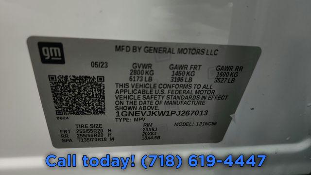 Navigation System, Front License Plate Bracket Mounting Package, Preferred Equipment Group 2LT, 10 Speakers, AM/FM radio: SiriusXM with 360L, Bose Premium 10-Speaker Audio System Feature, Premium audio system: Chevrolet Infotainment 3 Plus, Radio data system, Radio: Chevrolet Infotainment 3 Plus System w/Navi, SiriusXM w/360L, Air Conditioning, Automatic temperature control, Front dual zone A/C, Rear air conditioning, Rear window defroster, 6-Way Power Front Passenger Seat, 8-Way Power Driver Seat Adjuster, Power driver seat, Power steering, Power windows, Remote keyless entry, Steering wheel mounted audio controls, Four wheel independent suspension, Speed-sensing steering, Traction control, 4-Wheel Disc Brakes, ABS brakes, Dual front impact airbags, Dual front side impact airbags, Emergency communication system, Front anti-roll bar, Low tire pressure warning, Occupant sensing airbag, Overhead airbag, Rear anti-roll bar, Power Liftgate, Brake assist, Electronic Stability Control, Exterior Parking Camera Rear, Auto High-beam Headlights, Delay-off headlights, Fully automatic headlights, Panic alarm, Security system, Speed control, Bumpers: body-color, Heated door mirrors, Power door mirrors, Spoiler, Turn signal indicator mirrors, Apple CarPlay/Android Auto, Auto-dimming Rear-View mirror, Compass, Driver door bin, Driver vanity mirror, Front reading lights, Garage door transmitter, Heated steering wheel, Illuminated entry, Leather steering wheel, Not Equipped w/Rear Park Assist (060), Outside temperature display, Overhead console, Passenger vanity mirror, Rear reading lights, Tachometer, Telescoping steering wheel, Tilt steering wheel, Trip computer, Voltmeter, 3rd row seats: split-bench, Front Bucket Seats, Front Center Armrest, Front Passenger 2-Way Power Lumbar, Heated Driver & Front Passenger Seats, Heated front seats, Perforated Leather-Appointed Seat Trim, Power Driver Lumbar Control, Power passenger seat, Passenger door bin, Alloy wheels, Wheels: 20" Dark Aluminum, Rear window wiper, Variably intermittent wipers, 3.49 Axle Ratio