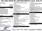 BEGIN THE SIMPLE PROCESS. PERSONALIZE THE PAYMENTS THAT FIT YOUR BUDGET, ADD YOUR TRADE-IN INFORMATION, APPLY FOR YOUR AUTO LOAN, SCHEDULE A PICKUP OR DELIVERY DATE. (HOME DELIVERY AVAILABLE*). EVERY VEHICLE HAS BEEN PRICED BELOW COST IN ORDER TO TURN INVENTORY QUICKLY AND PASS ON THE SAVINGS TO YOU! EACH VEHICLE COMES WITH A FREE LIMITED POWERTRAIN WARRANTY AND FREE CARFAX REPORT! WITH THESE SAVINGS THESE VEHICLES WONT LAST. CALL TO GET YOUR GREAT DEAL TODAY! (516) 774-3706.