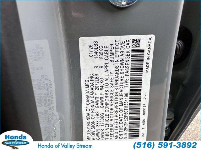 For more information on this 2026 Honda Civic, please call Honda of Valley Stream at (516) 591-3892 or with the contact form on this page. This vehicle's vin number is 2HGFE2F50TH554196 and is recorded as being in stock at Honda of Valley Stream at 164 E. Sunrise Highway in Valley Stream. See all cars from this dealership.